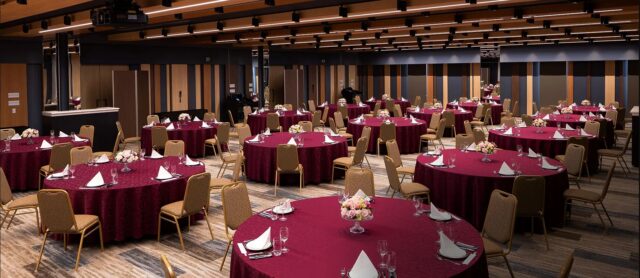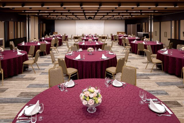 倉敷駅3分。デニムや白壁をモチーフにした洗練の空間で、お二人だけの祝宴を。最大200名様まで対応の「グランホール」は、自由な演出が映えるステージ。ご家族だけの挙式の後は