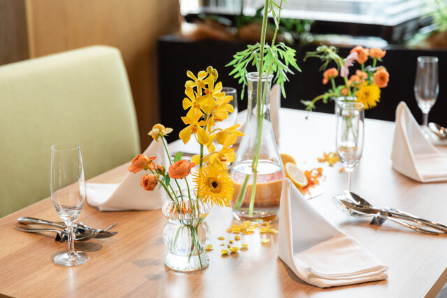 ご親族での心温まる挙式の後は、ホテル津センターパレス内「Dining EMI」でアットホームなパーティを。緑あふれるプライベート空間で、大切なご家族とゆっくり歓談を楽しめます。三重県産の旬の食材を活かしたこだわりの一皿が、感謝を伝える最高のおもてなしに。派手な演出よりも、美味しい料理と笑顔で絆を深める、穏やかで特別な時間をお約束します。