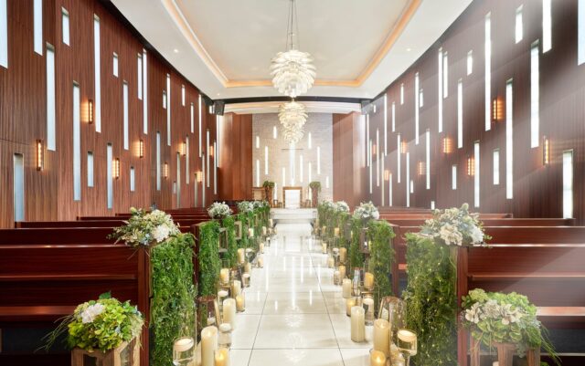 「生命の木」レッドシダーに包まれた独立型チャペル。時と共に美しさを増す芸術的な外観と、木の香り・陽光が織りなす神秘的な空間が魅力です。こだわりの音楽と照明演出で叶える、心震える感動のセレモニー。おふたりの物語が始まる特別な場所へ。